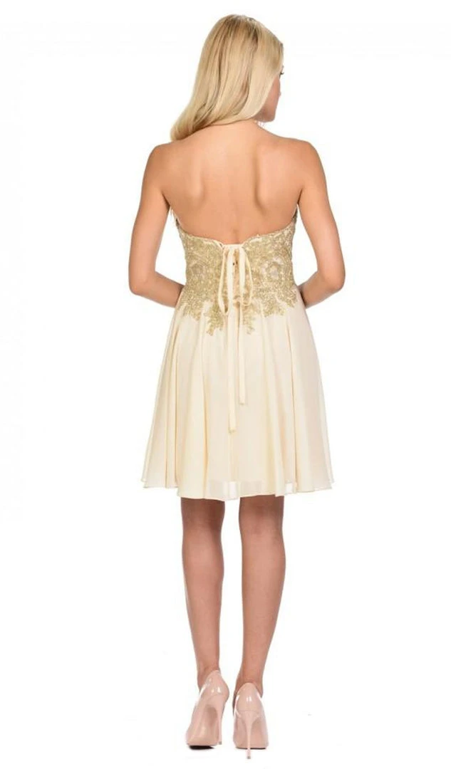 Have fun at your next social event wearing this charming cocktail dress by Lenovia 8110. Framed with a pronounced sweetheart neckline, the fitted bodice is gorgeously beautified with gold embroideries. Tailored in chiffon, the skirt reveals an a-line silhouette which tapers to mid-thighs. The back is mid-open with a lace up closure detail. You are sure to have one amazing evening with this lovely Lenovia masterpiece. Model is wearing Champagne Gold color.
