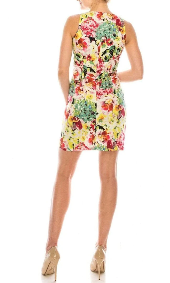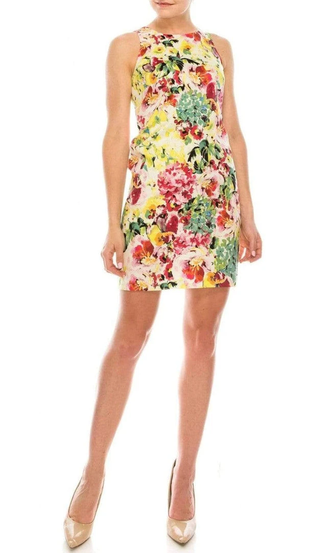Sparkle like the sun in this exquisite London Times T4642M creation. Sculpted with seams on a vibrant floral print silhouette, this dress shows a jewel neckline with a full back. The sheath skirt skims to a short hemline. Leave a trail of admirers when slipping on this London Times masterpiece.