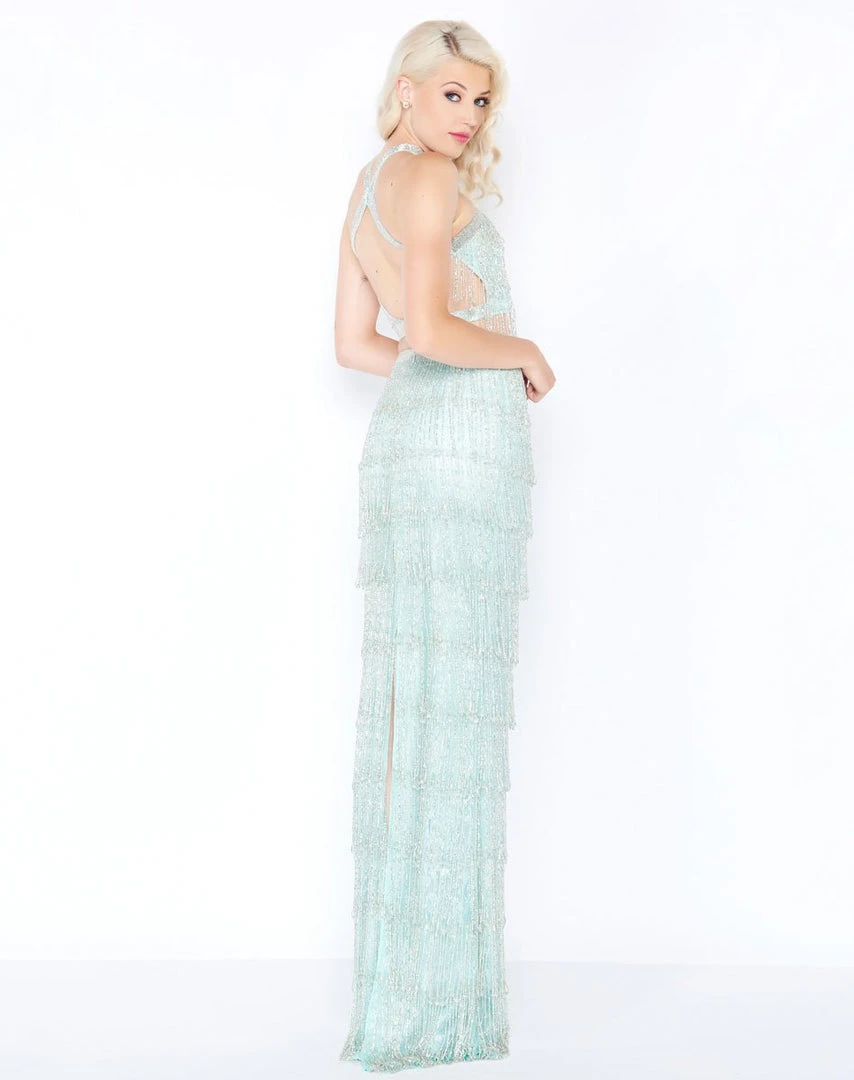 Dazzle everyone with your old Hollywood charm as you flaunt a flapper girl appeal in this gorgeous Mac Duggal Prom 4685M creation. Festooned with iridescent jewels stringed to exquisite fringes all throughout its fitted silhouette, this beauty showcases a strappy halter neckline with cut-in shoulders on a cropped top. Tailored with crisscrossed straps along the back, this ensemble features a triangular cutout that bestows allure to the entire mix. Showcasing a spectacle of the midriff, the high-waist sheath skirt parts at the back with a high slit as stunning beaded tassels navigate immaculately down to a full-length hemline. Be as charming as you can be when you walk into grandiose ballroom in this Mac Duggal masterpiece.