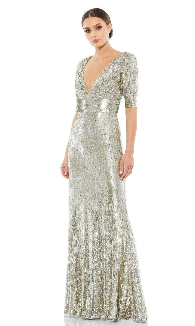 Go beyond beauty in a galactic evening gown in Mac Duggal 4707. This full length gown is decked out in dual-toned sequins throughout the fit and flare silhouette. The bodice features a plunging v-neckline and lightly puffed quester blouson sleeves. This Mac Duggal evening gown will not let anyone miss your grand entrance.