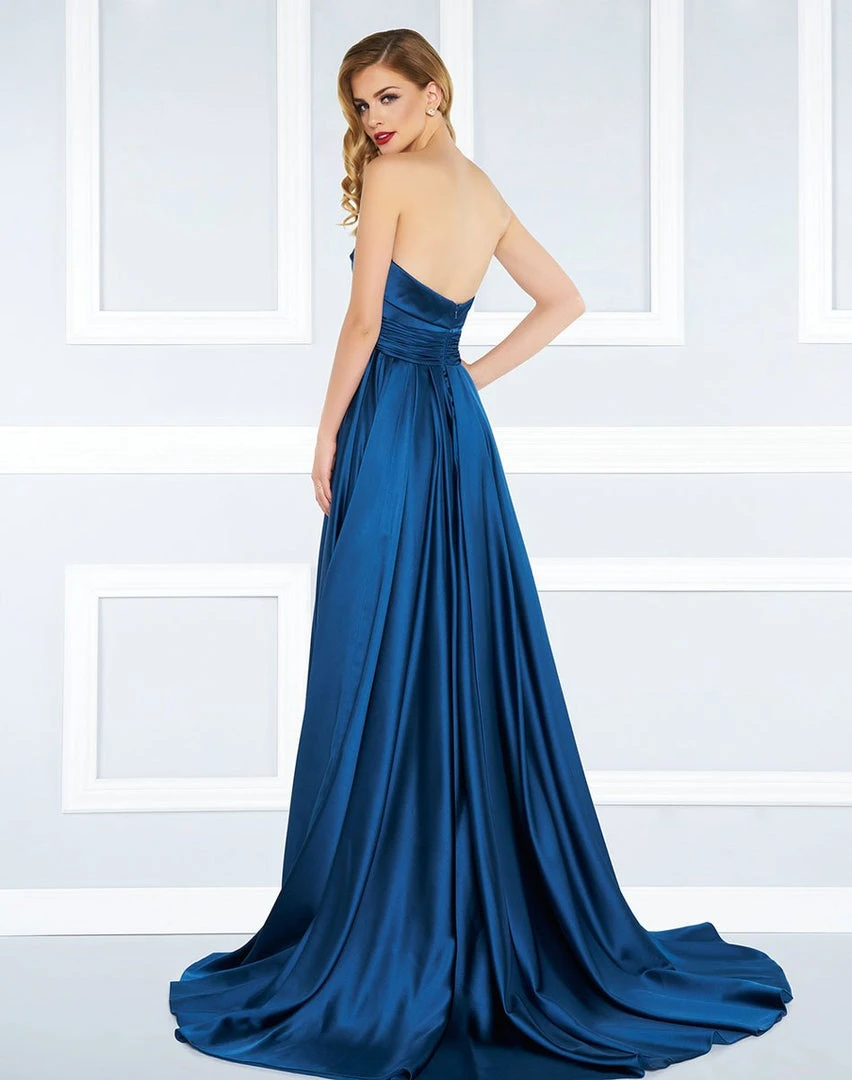 Details: Strapless, Straight Across neckline, Ruched waistband, High slit skirt, A-line gown