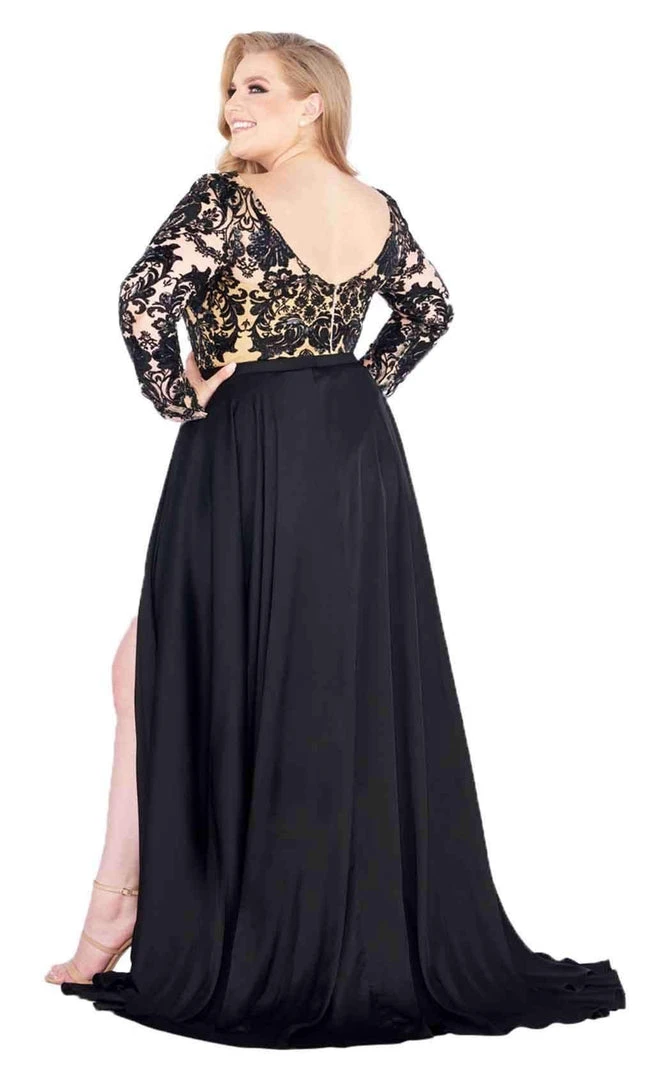 Get to have the power to wow the upscale crowd in this fantastically embellished Mac Duggal Fabulouss 66809 creation. Shimmering with sequins on a Baroque motif lace, this alluring piece reveals a bateau neckline framed with ornate long sleeves. Designed with aa scoop open back, this ensemble completes with a romper trimmed with a scallop-hemline. The solid silk chiffon overskirt parts with a high side slit and ends with a sweep of train. Look regal and simply captivating in this immaculately designed Mac Duggal masterpiece.