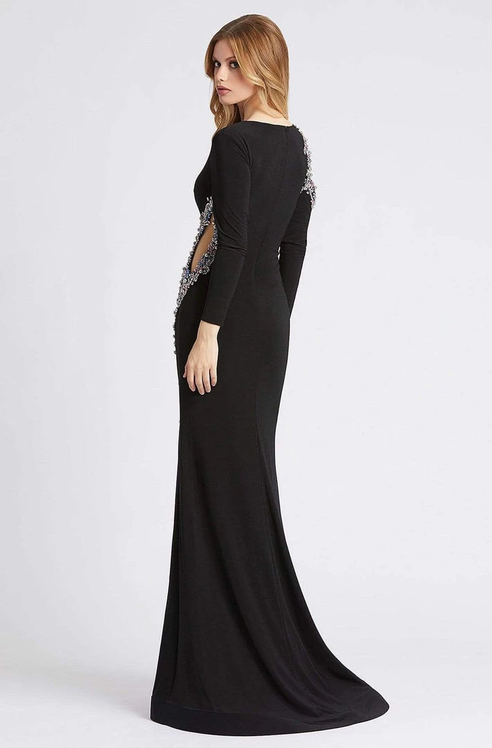 Create a perfect evening wearing this elegant evening gown by Mac Duggal Prom 66769. The fitted bodice offers a jewel neckline and long sleeves with cold shoulder cutout. Colorful beadwork accents the cold shoulder cutout and side to the thigh high slit. This dress offers a sheath silhouette that tapers to full length finished with a sweep train. The full back is secured with a center zipper closure. This Mac Duggal ensemble will absolutely make you feel special.