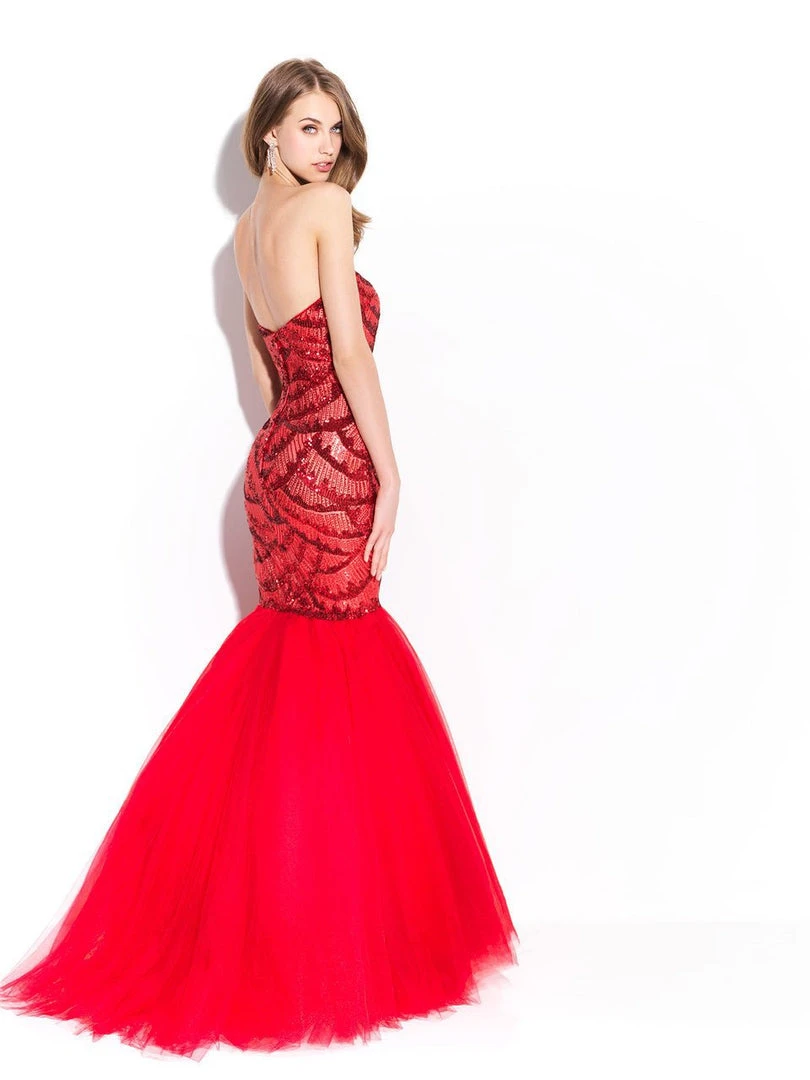 Spangled sequins create a layered effect over the bodice of this strapless mermaid gown.