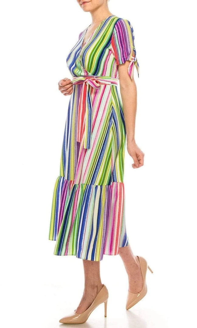 Mesmerize everyone with the stylish appeal of this Maggy London G4464M creation. Designed with multi-colored stripes, this dress flaunts a surplice v-neckline with tie ribbon short sleeves. The full back is accented with a zipper closure. The waist has a tie sash. The A-line skirt flares into a paneled tea length hemline. Claim the spotlight in this Maggy London masterpiece.