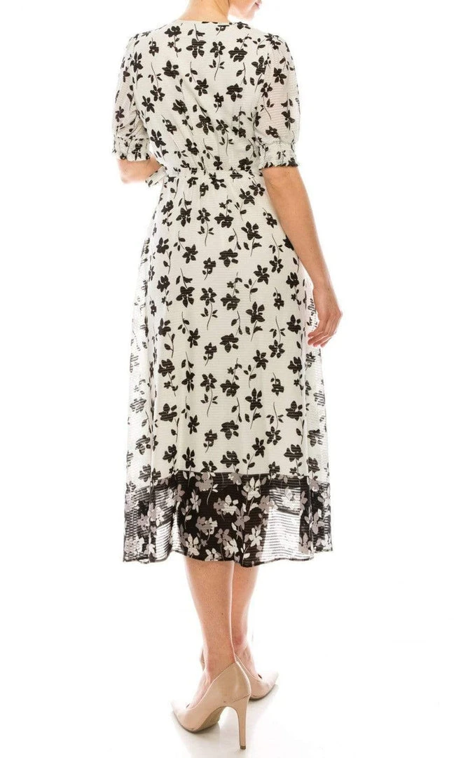 Radiate stylish presence in this brilliant midi dress by Maison Tara 95014M. Classy floral print crepe chiffon dress featured with smocked short sleeves, surplice V neckline with self-fabric waist tie ribbon, and an A-line skirt with contrasting sheer hem. Showcase your inspired feminine flair in this Maison Tara creation.