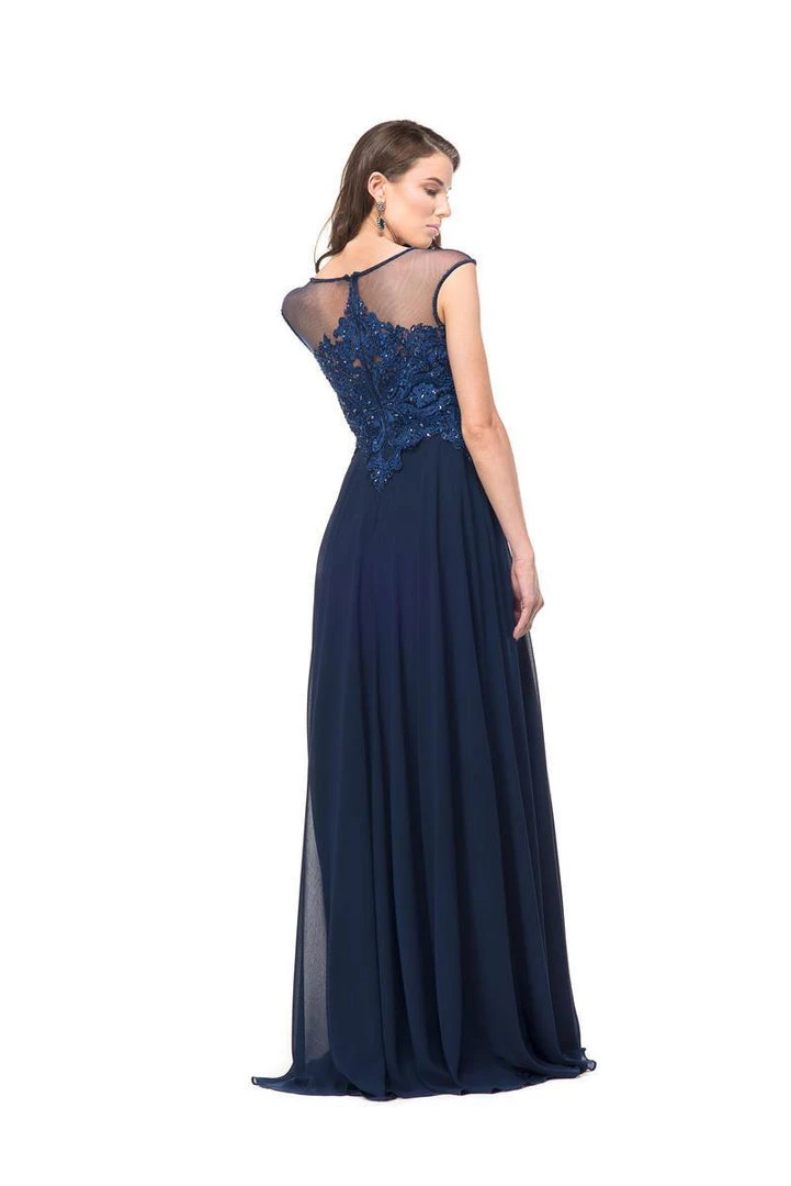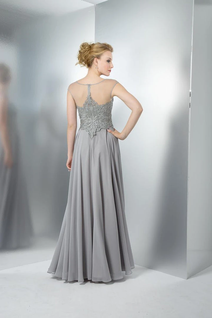 Glide into a party in stunning elegance and effortless grace in this fascinating Marsoni M107 creation. Spectacularly embroidered with intricate scroll design peppered with rhinestones, this lovely piece showcases a bateau illusion over a sweetheart neckline with sheer cap sleeves and a full back. Bordered with an elaborate lace embroidery at the natural waist, the A-line skirt streams beautifully down as it softly pleats down to a full-length hem. Move and sway with flawless refinement all night long in this Marsoni by Colors masterpiece.