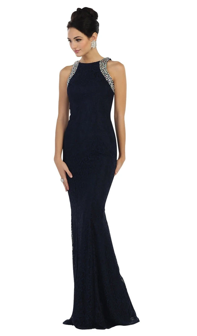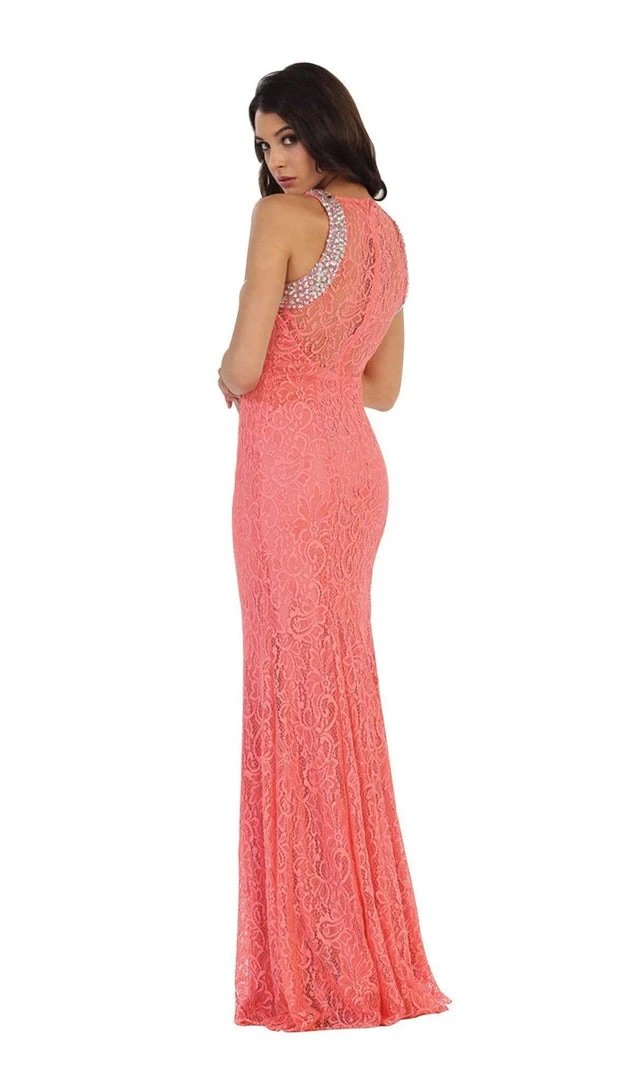 Go in the party and do that walk of a regal beauty in this fascinating May Queen MQ1475 creation. Overlaid with a stunning sheer lace fabric, this divine piece unveils bead and rhinestone embellishments?ÿtrimming the sleeveless bodice and lace material. The sheath skirt streams wondrously down to a full-length hemline and subtle train. This May Queen masterpiece will display your natural beauty and elegance.