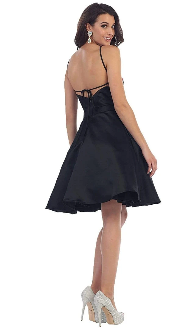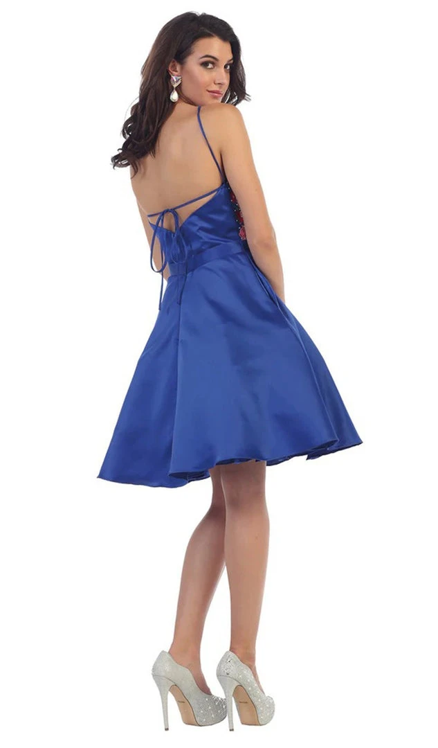Promote attention-grabbing style in this stunning dress by May Queen MQ1446. A dress designed with an illusion halter neckline and floral details moving to side giving way to highlight the sweetheart bodice of this fancy creation. This dress also has an A-line silhouette to complete that youthful creation. The back of this dress features a strappy feature that provides that skin revealing approach and ends with a zipper closure. Get noticed in this radiant dress from May Queen.