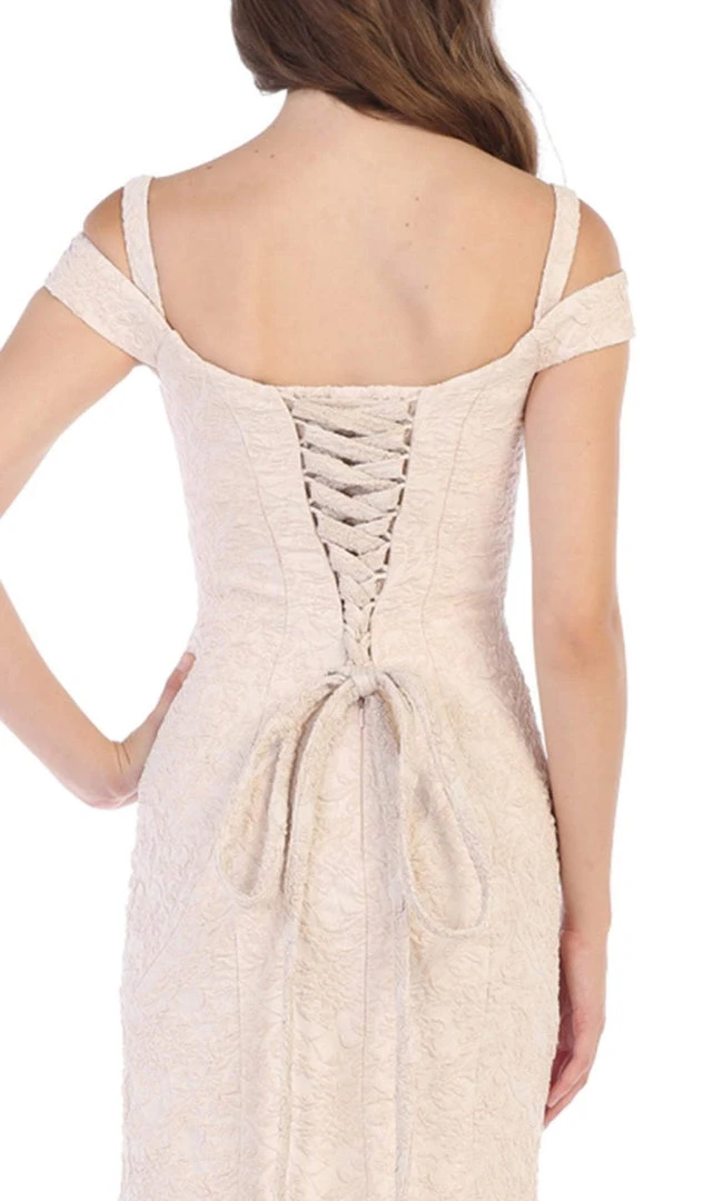 Dare to express yourself in this brazen dress from May Queen RQ7663. Fashions an off the shoulder neckline with shoulder straps. The dress highlights your figure with its fitted bodice and is designed with a lace up back for an adjustable fit. The skirt has a fit and flare silhouette added with a thigh high slit and sweep train finish. Dress to the nines in this glam look by May Queen.