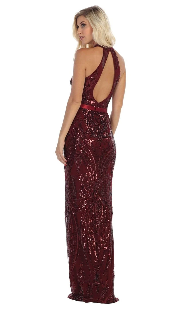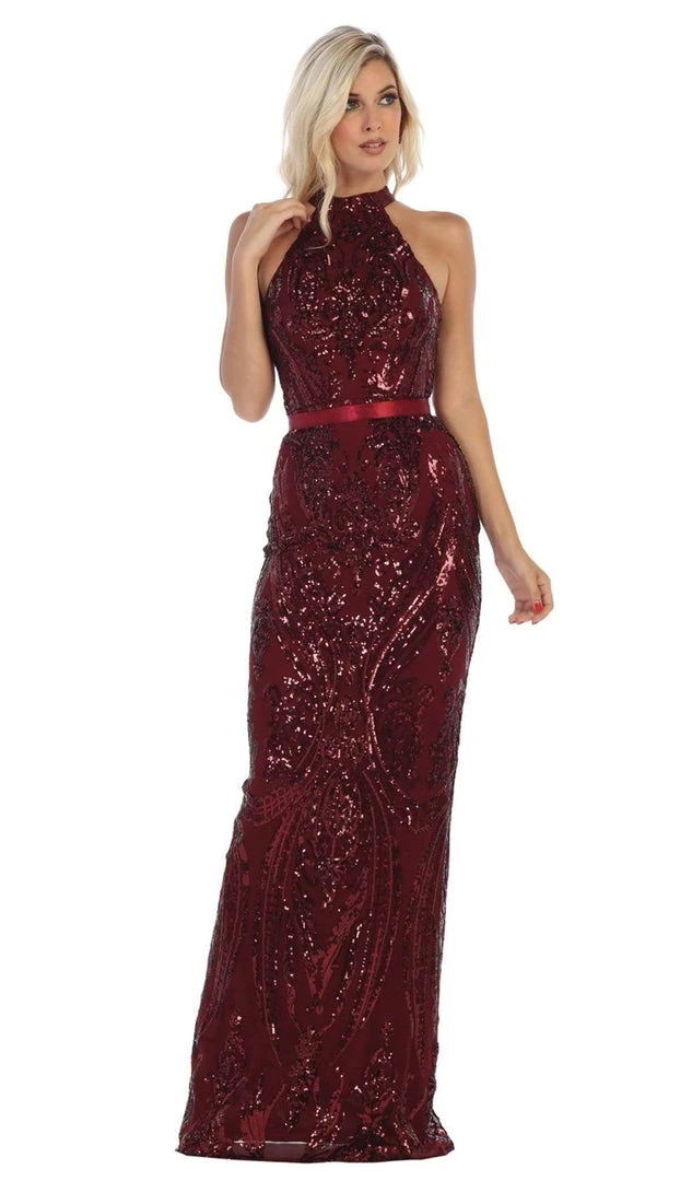 Look sophisticated and mature in this simple yet chic look from May Queen RQ7696. Fashions a sleeveless, high halter neckline with fitted bodice richly decorated with glittering embellishments. The bodice flaunts an open back detail and is cinched at the waist with a thin ribbon band. The skirt has a sheath silhouette and runs at full length hem. Turn heads instantly when you wear this May Queen look. Model is wearing Burgundy color.