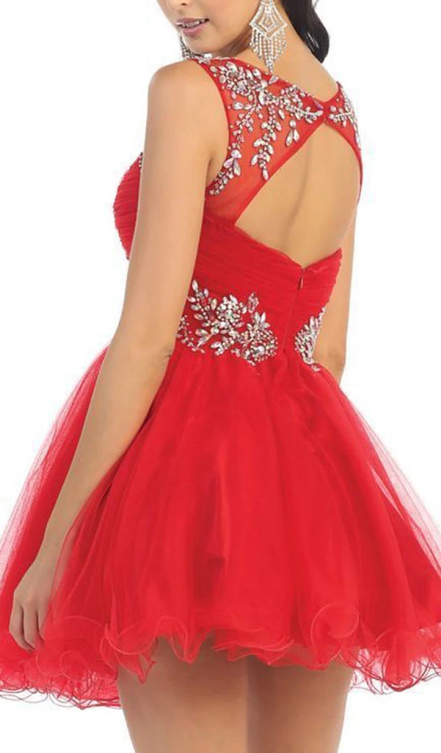 | Details: | Beaded, Sleeveless, Illusion neckline, Tea length skirt, Low back |