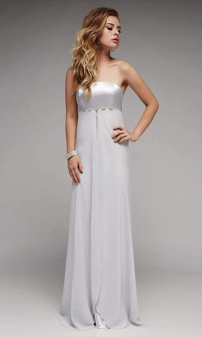 This long satin evening gown is done in lovely straight neckline and fine spaghetti strap with draped Chiffon fabric trimmed perfectly from the under bust highlighting the empire waist of this alluring floor length dress. This Milano formal creation is simply breathtaking!