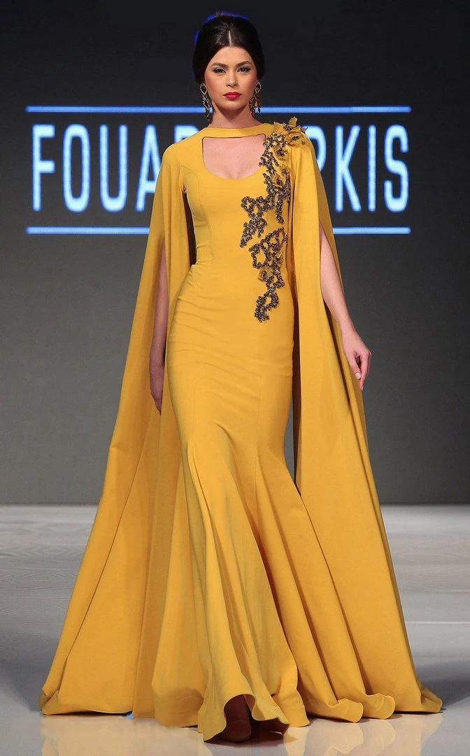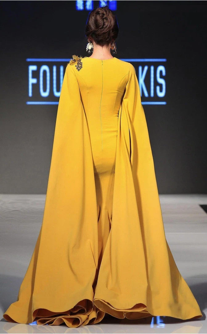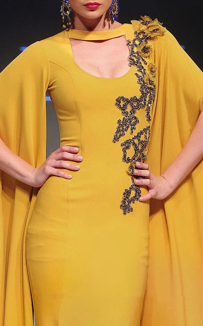 | Details: | Draped sleeves, High neck, Bust cut-out, Embellished detail, Trumpet skirt, Back zipper closure |