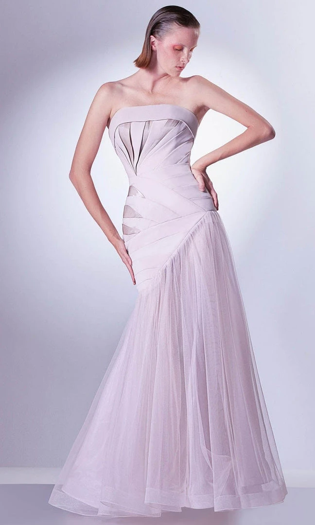 Strike a pose as you enter the room in this exquisite MNM Couture G1343 creation. This stunning gown features a strapless and straight across neckline trimmed with satin fabric. The fitted bodice highlights a pleated crisscross pattern and the mid-open back secured with zipper closure. The gathered tulle skirt parades a full length A-line silhouette finished off with a horsehair hem. Bloom with beauty and love as you saunter towards forever in this MNM Couture masterpiece. Each of MNM Couture design offers cutting edge styles that will make every woman look sophisticated Model is wearing Blush color.