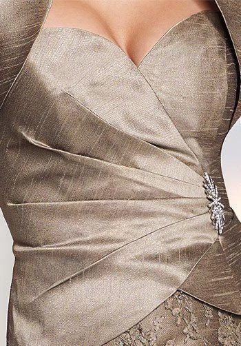 Two-piece silk essence and lace suit, strapless sweetheart mock two-piece knee-length sheath, mock-wrap bodice with side jewel brooch accent, lace overlay skirt, matching bolero jacket with three-quarter length sleeves. Removable straps included.