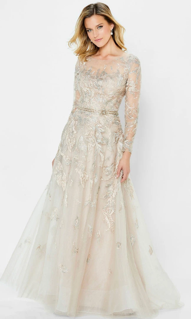 Emanate a sophisticated vibe while making a dramatic entrance in this classy Montage by Mon Cheri 122906 gown. This evening gown has an A-line silhouette and is embroidered in tonal metallic threads on tulle fabric. It also has an illusion bateau neckline and long sleeves. This elegant mother of the bride gown is finished with a beaded belt, a partial illusion back, and a sweep train. Make an extraordinary statement when you walk in this classy Montage by Mon Cheri dress. Whether your style is modern trendy or timeless classic, Mon Cheri will clothe with poise, elegance and grace for your momentous occasion.