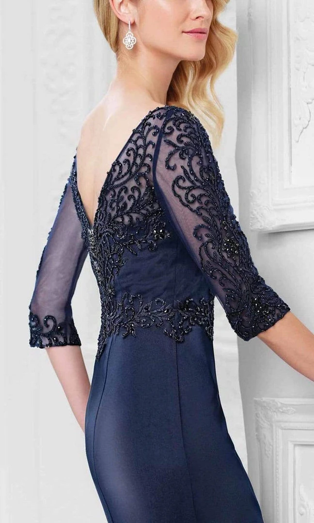 Crepe satin fit and flare gown with hand-beaded illusion three-quarter length sleeves, beaded illusion bateau neckline, beaded sweetheart bodice, beaded illusion V-back.