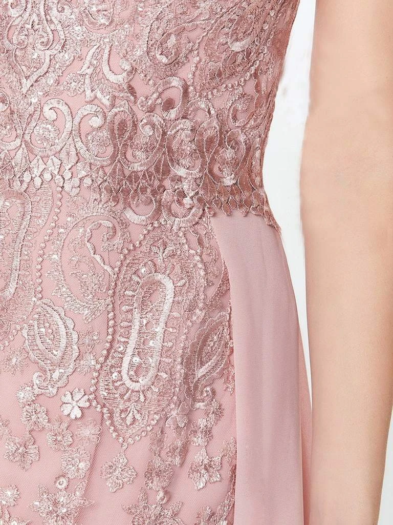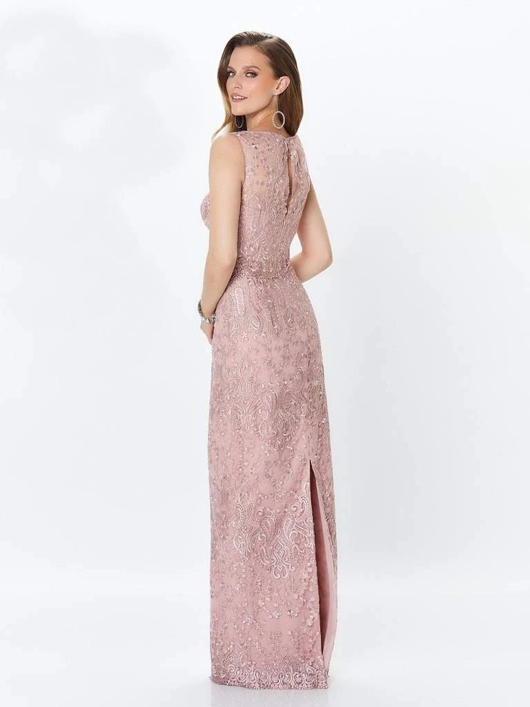 This regal two-piece set brandishes in an embroidered lace embellished special occasion dress. The top features a sheer scoop neckline trimmed with beading, a soft sweetheart bodice with a natural waist, a lace illusion back with a keyhole. The sheath skirt features a back center slit for an ease movement. A detachable chiffon sweep train fastens at the natural waist for a seamless, imperial look. Separate three-quarter embroidered lace illusion sleeves and a matching chiffon shawl with beaded trim are included for even more versatile look.