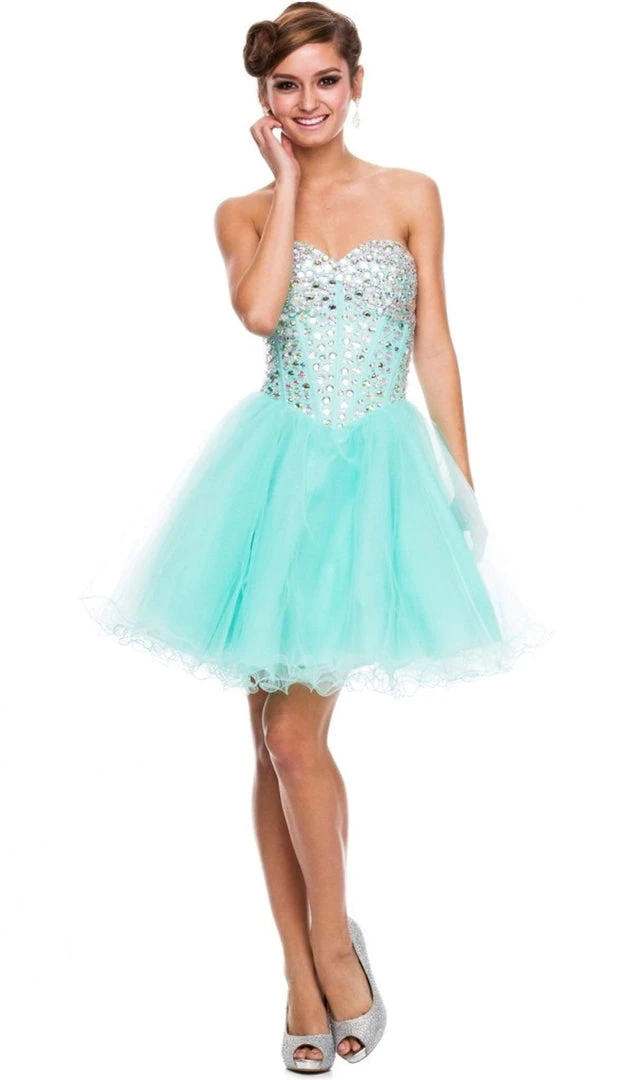 Glitter and shine in this fabulous cocktail dress by Nox Anabel 6015. The strapless sweetheart bodice has large crystal embellishments for added sparkle. Layer after layer of glamorous tulle make up the playful and fun style wire-hemmed skirt that falls to the mid-thigh. This brilliant look by Nox Anabel is sure to be a delight at the prom, party or on special birthday!