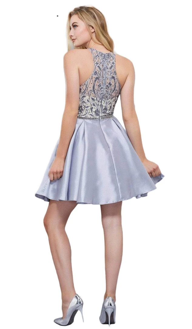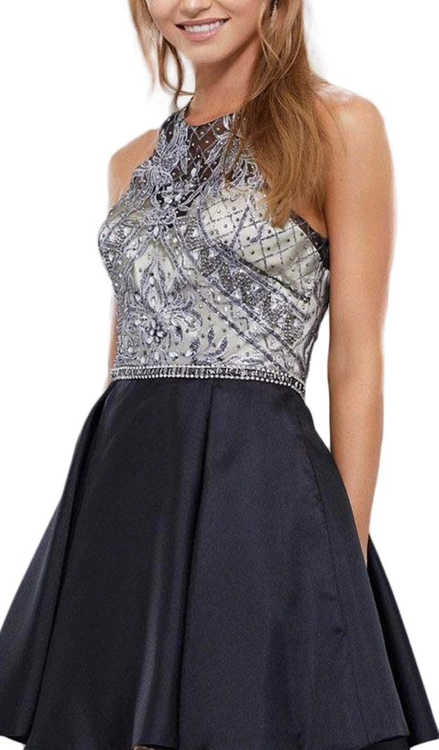 Show off your classy style when you wear this dress by Nox Anabel 6328. This short dress features an illusion halter neckline in a sleeveless bodice that is adorned with sparkling embellishments. This dress also features a sheer beaded razor back, a short box pleated skirt, and a zipper closure for a perfect finish. Go with fun, gorgeous, and youthful in this dress by Nox Anabel. Model is wearing Black and Silver colors.