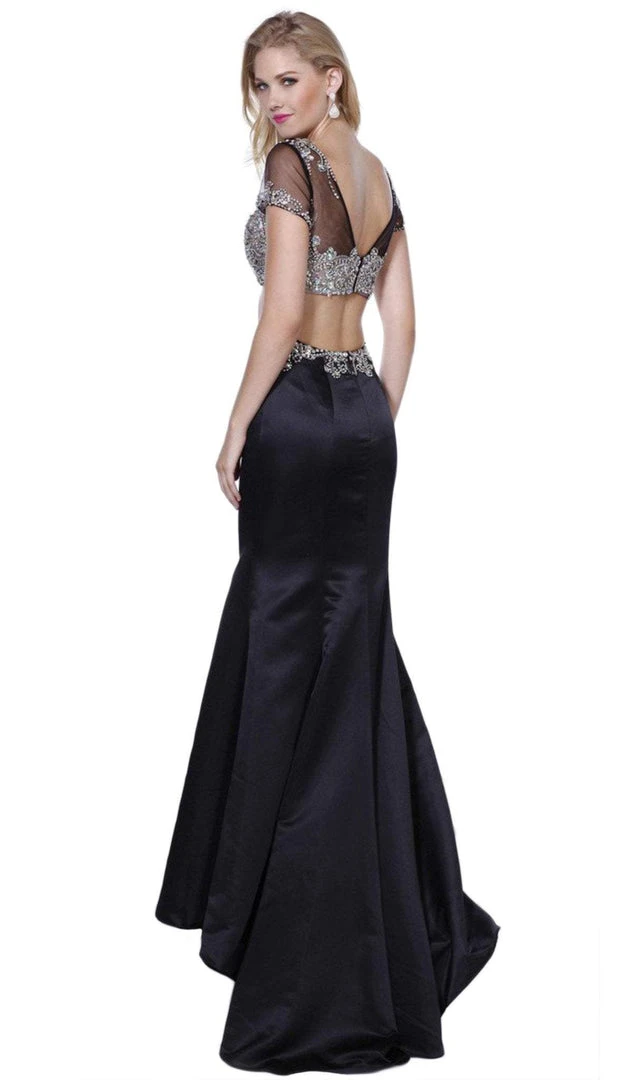 Make yourself into a vision of loveliness in this spectacular full length gown by Nox Anabel 8184 long dress. This two piece ensemble showcases an illusion bateau neckline over a framed sweetheart lining and short sleeves. The bodice and upper skirt is stunningly designed with crystals and rhinestones. This floor length skirt showcases a trumpet silhouette. The back has a prominent v shape and is enclosed with a center zipper. This Nox Anabel design will make sure you turn heads all night long.