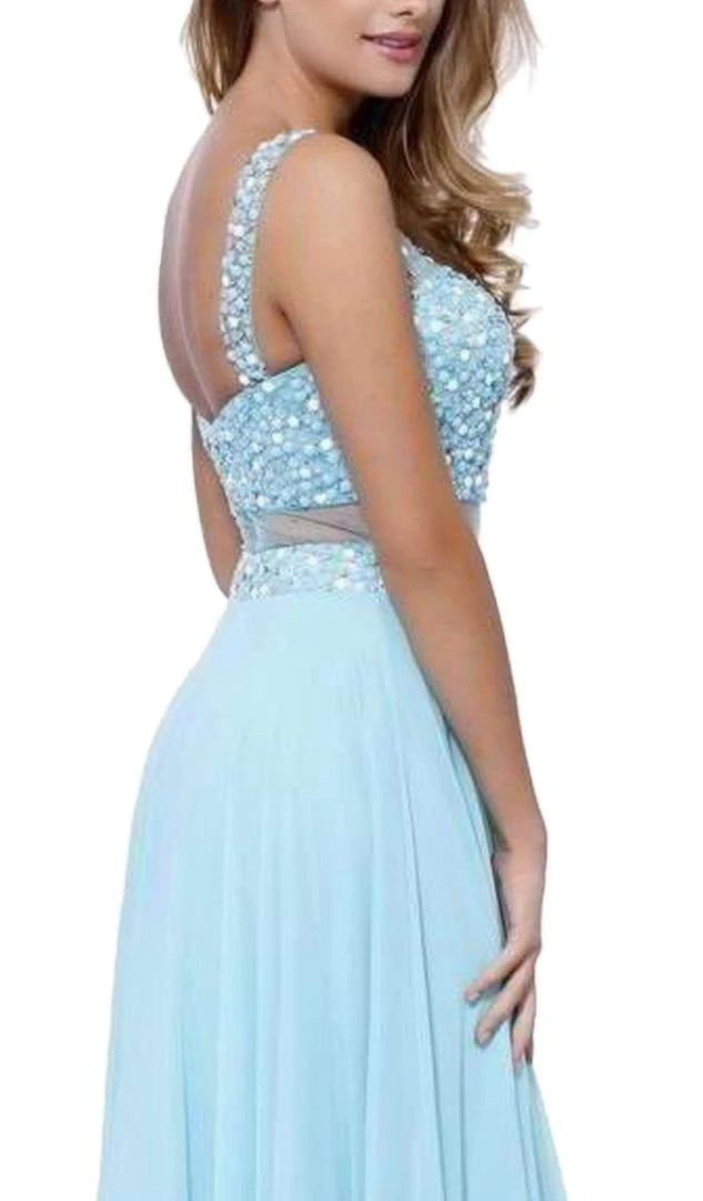 Make waves in this stunning evening gown by Nox Anabel 8251. This sleeveless dress has an illusion neckline and embellished bodice. Sheer panels accent the midriff and boasts tonal shining stones. The skirt has a gentle sweep and finishes with a full length hem. This design from Nox Anabel is sure to be both comfy and fashionable.