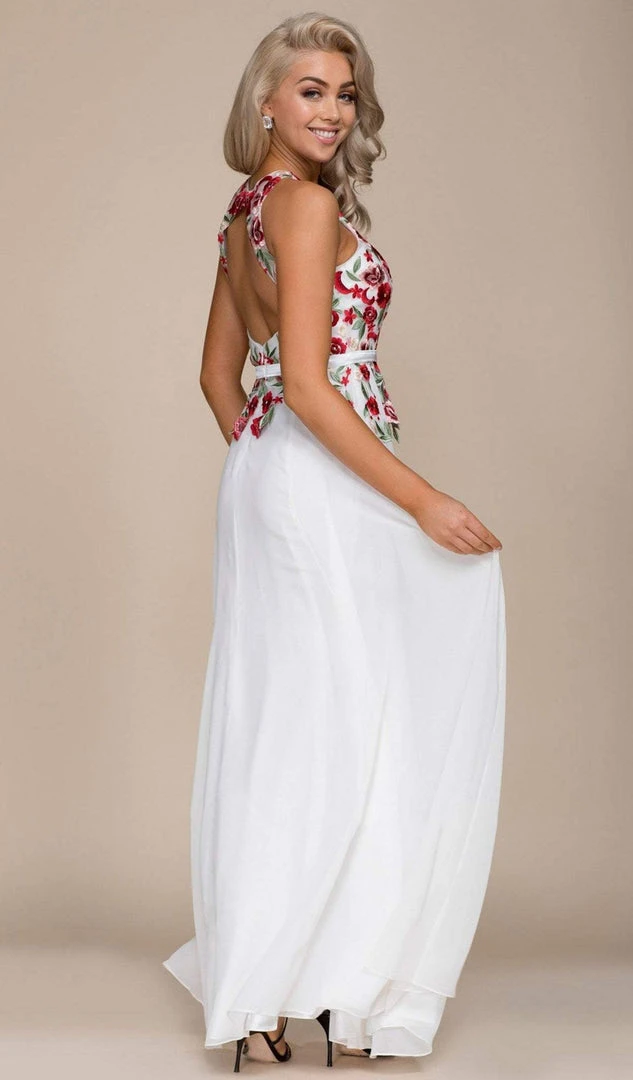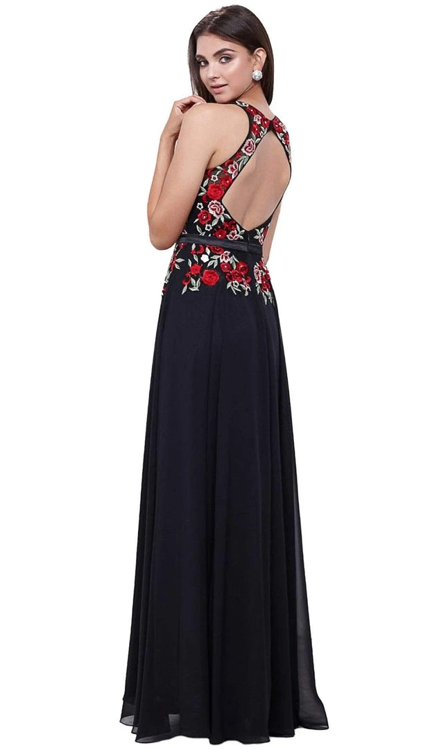 Wrap up in this winning style for evening by Nox Anabel 8275. The dress boasts a sleeveless, illusion halter neckline with floral embroidery on the bodice. The skirt runs floor length and flares an A-line silhouette. Start your night out right with a stylish dress from Nox Anabel.?ÿ