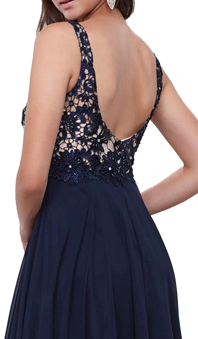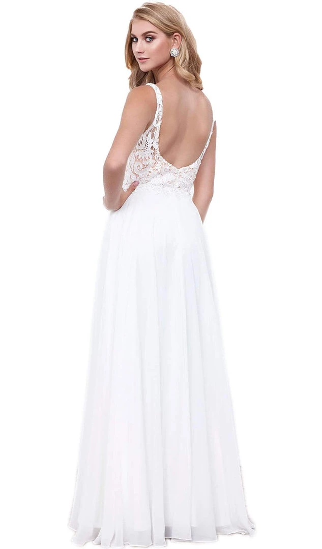 Stand out in this elegant long Nox Anabel 8297 creation. Features sleeveless laced bodice over sheer panel that beautifully highlights the V-neckline with a sheer modesty inset and a scoop open back. Full length layered and finely gathered chiffon skirt that elegantly flows to the floor with a ruffled hem. This NOx Anabel masterpiece definitely parades elegance and classy style.