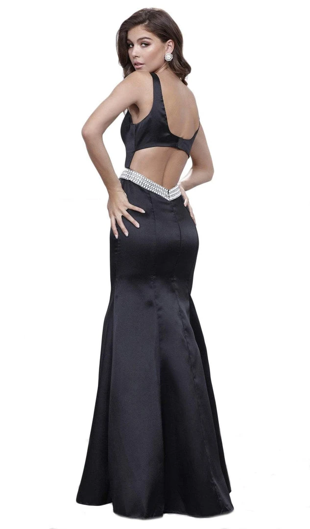 Wow everyone in this sophisticated Nox Anabel 8320 creation. Gorgeously flaunting sculpting seams along the bodice, this stunning piece features a jewel neckline and a scoop detail with an alluring cutout on its back. Cinched with a beaded waistband, the full length trumpet skirt cascades spectacularly as it ends with pizzazz and style. Make the crowd stop and stare at your newly found iridescence in this sophisticated Nox Anabel masterpiece.