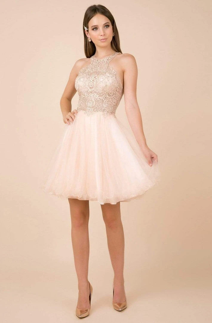 Capture the glamour as you appear in this stylish cocktail dress by Nox Anabel E696. Sophisticatedly designed in lace fabric, the sheer bodice features an illusion halter neckline as the back flaunts a back cutout detail. Adorned with fabulous pleats, the a-line skirt playfully flares to the mid-thigh length as it finishes with curled hemline. Your youthful and girlish look will melt every one hearts and leave a lasting impression on them with this Nox Anabel piece.