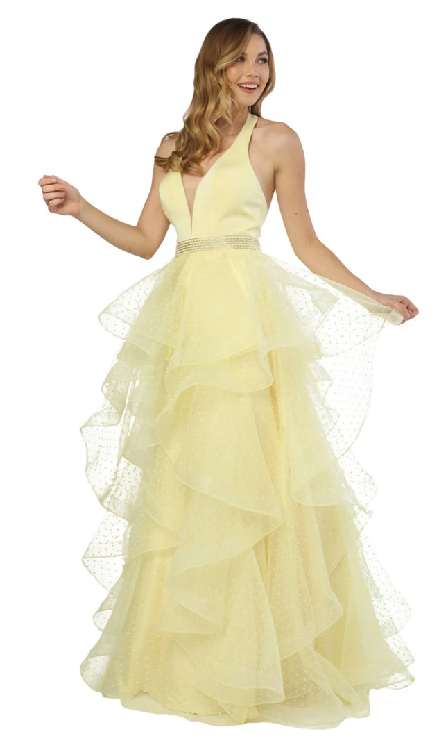 Unveil the style goddess in you in this elegantly fabricated Nox Anabel T256 creation. Contoured with seams along the sleeveless bodice, this stunner flourishes a plunging halter neckline with an illusion modesty inset. Defined with a mid-open back and embraced with a silver beaded waist design, this lavish ensemble flares in tiers of dotted lace cascading flatteringly down to touch the floor with a subtle train. Inspire people to give you an appreciative once over in this chic Nox Anabel masterpiece.