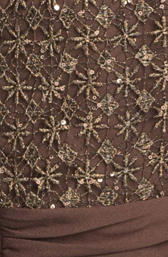 Embody a sophisticated style that will encapsulate your feminine flair in this Patra 12615 creation. Designer detailed with a geometric starburst gilded lace along its bodice, this exquisite piece flatters with a v-neckline framed with delicate cap sleeves. Fabricated with a full back, this ensemble reveals a ruched asymmetrical tie-knot detail along the waist. The chiffon A-line skirt flows in soft waves as it hovers just about those exquisite stilettoes with its full-length hem. Give off a luminous charm that captivates the crowd in this Patra masterpiece.
