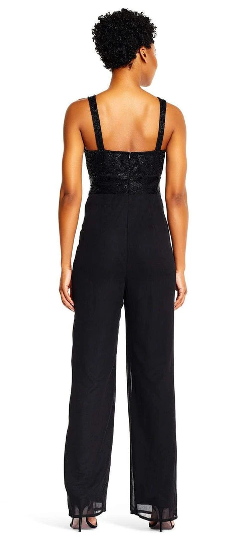Create a perfect evening wearing this classy and comfortable creation by Adrianna Papell AP1E202207. The fitted bodice is glamorously beaded as it reveals a bateau neckline and wide waistband complemented with a mid-open back. The jumpsuit is tailored in chiffon and tapers to full length hemline as a center zipper closure secures the back. With a little glam and a lot of class, this full length evening ensemble by Adrianna Papell is an evening event winner.