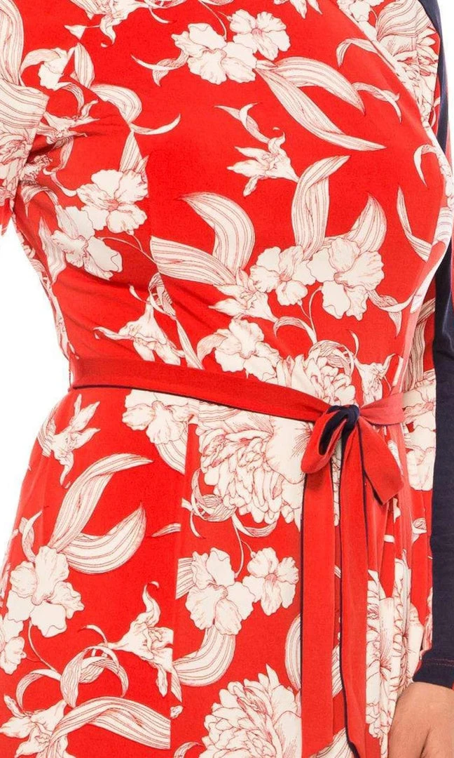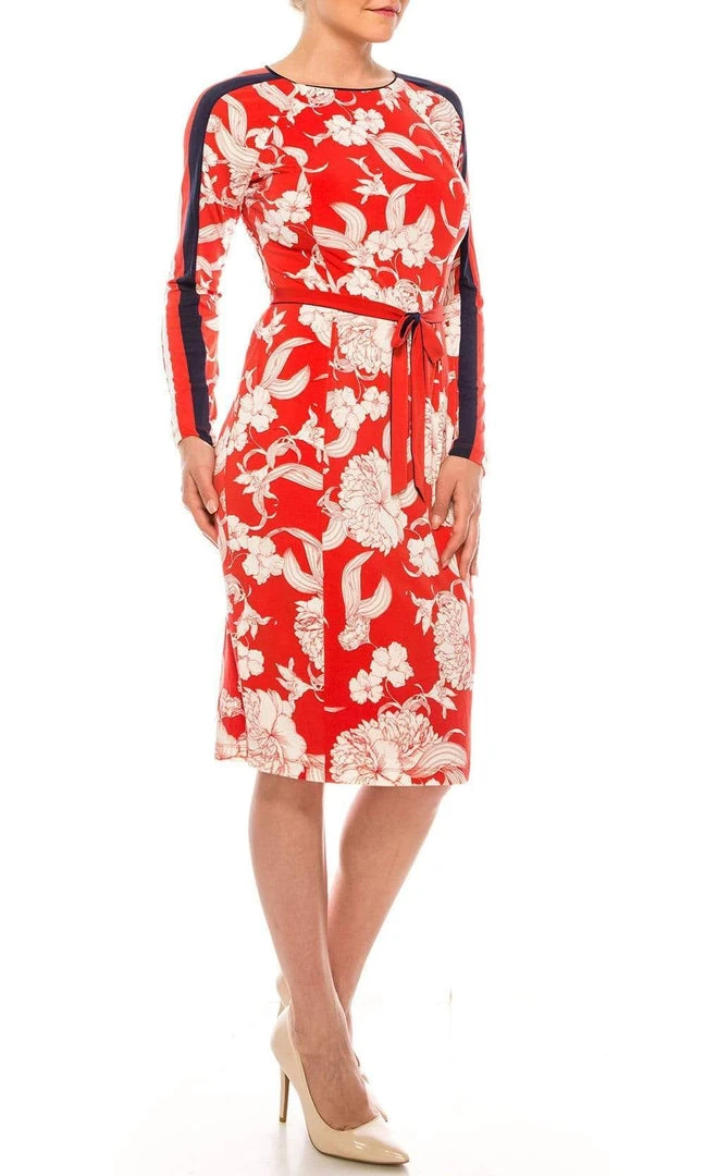 Get noticed in any crowd wearing this Maggy London G4327M dress. This knee-length dress showcases a jewel neckline supported by long sleeves in a fitted and floral printed bodice. Revealing a sheath silhouette, this also displays a full back with back zipper closure. Be beautiful in this Maggy London design. Model is wearing Red Navy color.