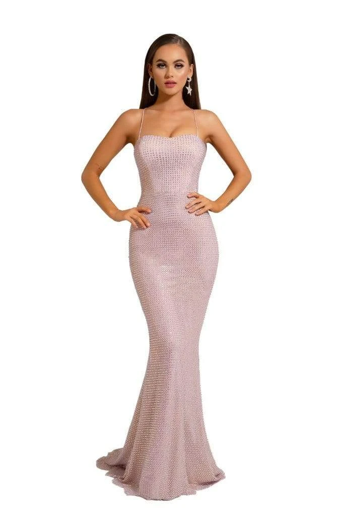 Brave the evening with a temptress beauty wearing Portia and Scarlett PS6328. This dazzling formal evening piece is showcased in full-length beaded net overlay fabric, that glimmers with a form-flattering silhouette. Features a modified sweetheart shaped neckline, and a sleeveless bodice held to fit with lace-up straps on the open back. The sheath skirt is styled with graceful flare to full length hem. The night is yours in a spectacular dress from Portia and Scarlett.