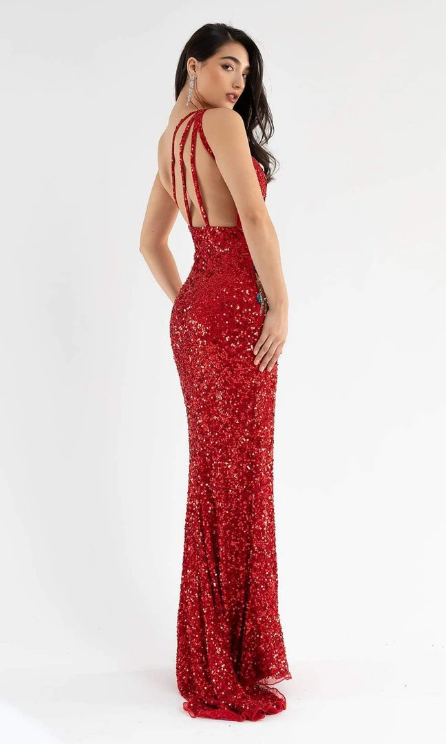 Sparkle in beauty wearing this Primavera Couture 3738. This dress has a peacock-inspired vibe due to the way it incorporates beads and sequins. It features an asymmetric neckline that is held in place by one shoulder strap and leads to an open strappy back. The skirt reveals a high slit as it touches the floor with a train. Shimmer all night long in this sophisticated Primavera Couture masterpiece. Primavera Couture’s sparkling long sequin dresses and cocktail dresses will dazzle you with compliments as these dresses are extremely impressive.