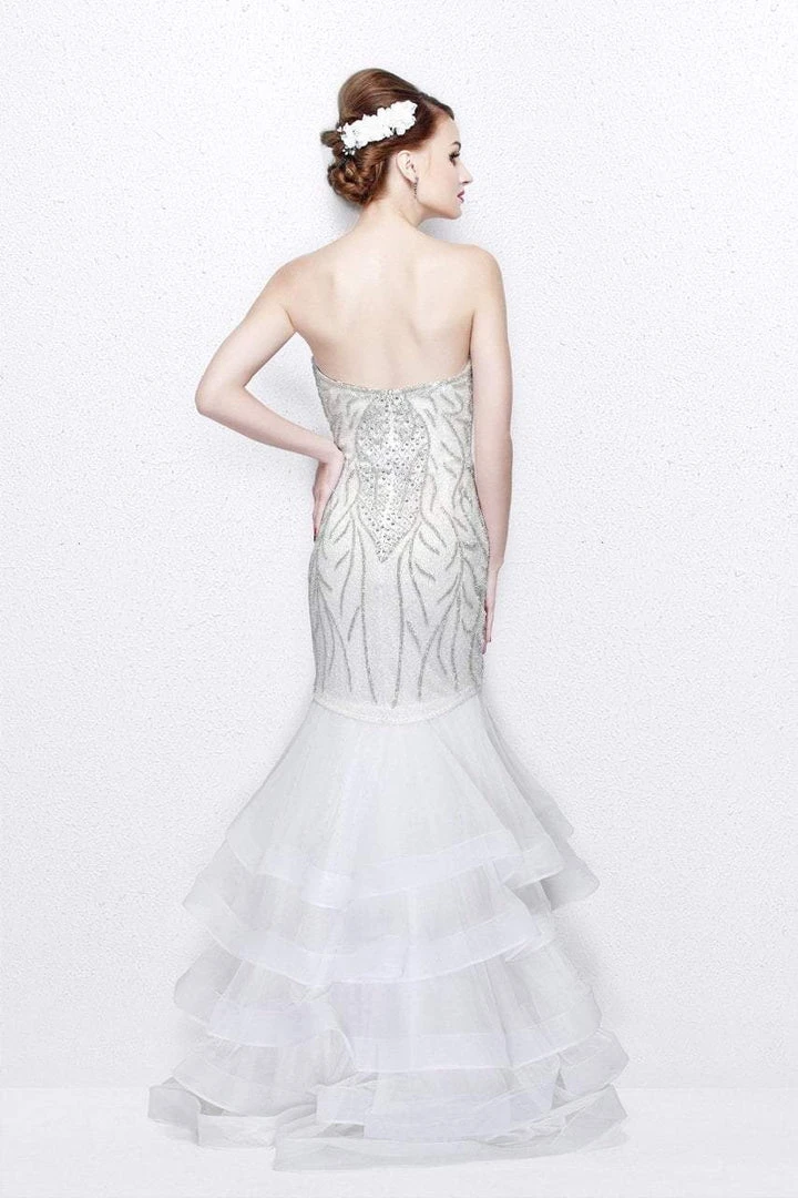 Captivate attention as you capture hearts in this glamorous Primavera Couture 1854 creation. Flaunting a splendidly ornate silhouette, this stunner features a strapless, sweetheart neckline with a sultry semi-open back. Sculpting generously from the hips down to the mid-thigh, the lavish tiered mermaid skirt flourishes as it courses down and completes in a full-length horsehair-trimmed hem. Be a timeless beauty in this gorgeous piece by Primavera Couture. Model is wearing the Ivory, Burgundy and Midnight colors.