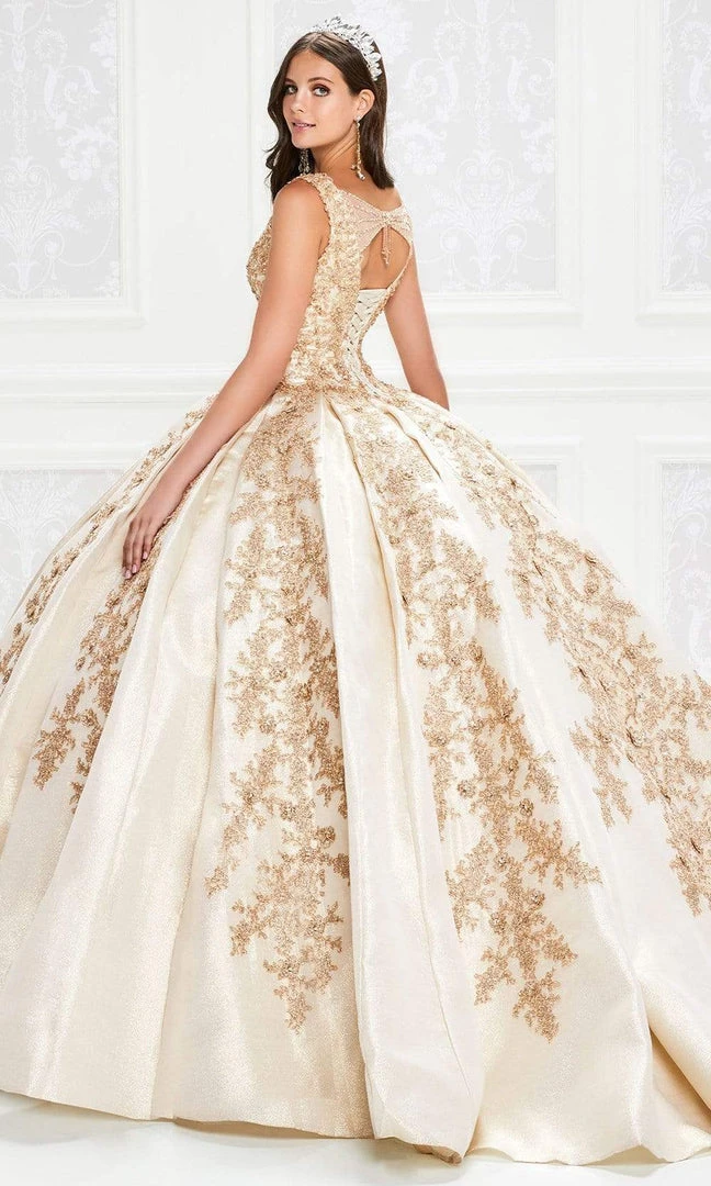 Get ready for everyone to stop and stare when you show up in this Princesa by Ariana Vara PR12013. Crafted in lame and metallic corded lace, this ball gown features a plunging V-neckline, beaded bodice, basque waist, corset back and a full pleated skirt. Features a matching jacket. You’ll be envied in an unbeatable gown from Princesa by Ariana Vara. Model is wearing Champagne/Gold color.
