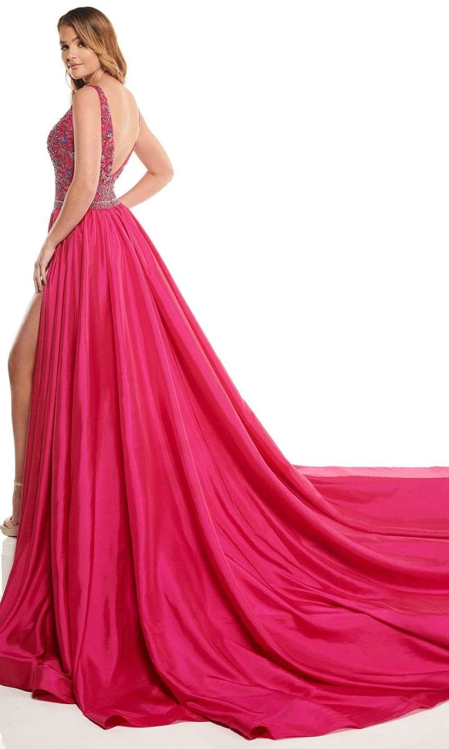 Wow the crowd as you show up in this majestic masterpiece by Rachel Allan 50005. The fitted bodice features crystal and stone embellishments, framed with a wide V neckline, as the back displays an open V cut. A side slit highlights the a-line skirt and graces to a full length hemline, completed with a chapel train. Claim your spot as the darling of the ball with this stunning piece by Rachel Allan.