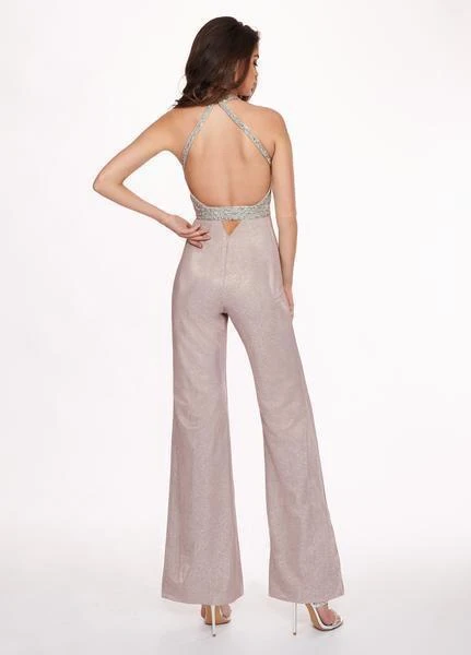 Flaunt your best asset in this scintillating masterpiece by Rachel Allan 6441. This fabulous dress features a fitted bodice fully embellished in opulent sparkling bead work topped with a halter neckline. Sexy open back features a beaded belted waistband flaunting a slim fitting shimmering jersey material that shows off your natural curve. This jumpsuit ensemble tapers to full length secured with a center zipper closure detail. Fashionably chic and fabulous this enticing Rachel Allan dress is an exotic treat.