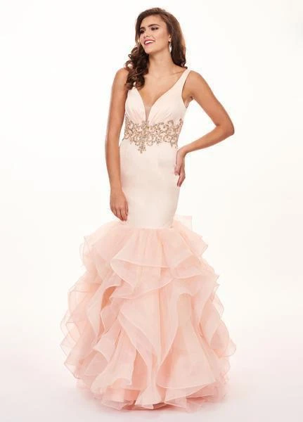 Soar to new heights of fashion in this magnificently gorgeous gown by Rachel Allan 6494. This stunning satin dress features a sleeveless frame, deep V neckline with sheer mesh panel and an elaborate beadworks highlighting the midriff. The back is structured with scoop shaped, designed with corset lace-up with center zipper closure. The tiered ruffled organza mermaid skirt is trimmed with horsehair edges and cascades perfectly to the floor with sweep train finish. Every girl deserves to have a fun and exciting senior prom and this eye catching Rachel Allan creation is sure to bring your inner diva in no time!