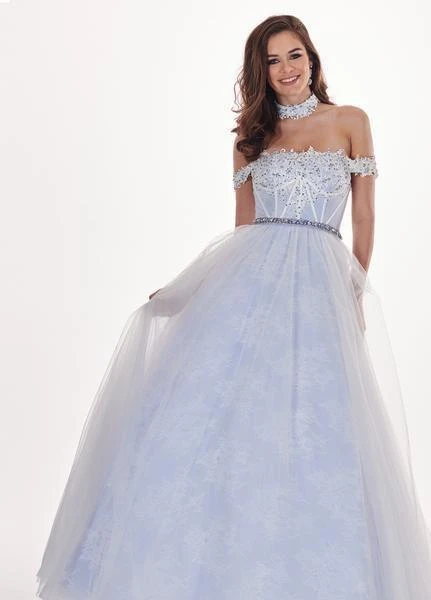 Get a timeless and trendy look in a princess inspired gown from Rachel Allan 6516. This picture perfect gown feature an off-the-shoulder straight neckline and a choker with dainty lace applique and beaded accents. The bodice is framed with exposed corset boning and the waist is cinched by a belt embellished with jewel stone. The soft tulle gossamer skirt complements to the beautiful full-length Ballgown silhouette of the dress with white lace underneath. Make it your Prom night worth reminiscing in this decadent Rachel Allan creation.
