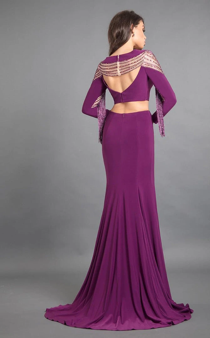 | Details: | Two Piece, Sheer Inset Detail at the Bust, Seams, Long Sleeves, Tassel, Floor Length, Jersey, Back Cutout, Back Zipper Closure, Sweep Train |