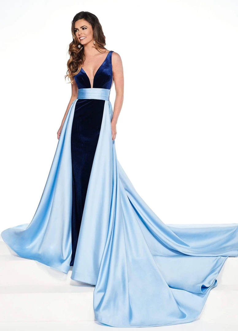 Waltz into the party looking fabulous in this design by Rachel Allan 5076. Pleases a sleeveless, deep V-neckline with sheer panels on its fitted bodice. The velvet dress flaunts a low V-back and the waist is wrapped in a wide satin band with covered buttons. It has a full length sheath skirt overlaid with an A-line overskirt with a sweep train finish. This Rachel Allan evening gown will not let anyone miss your grand entrance.