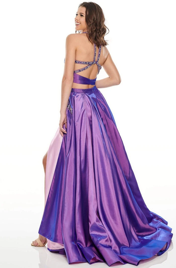 Make a fashion forward statement at your upcoming social event with this Rachel Allan Prom 7009 masterpiece. This two piece dress features a beaded crop top embellished with tone on tone beading, framed with a high halter neckline with a peep hole cutout detail. The a-line skirt reveals a high slit for a fun and flirty effect and convenient side pockets. The back of this dress displays a strappy criss cross closure and a dramatic sweep train. You are certain to turn heads with this glamorous Rachel Allan Prom ensemble.