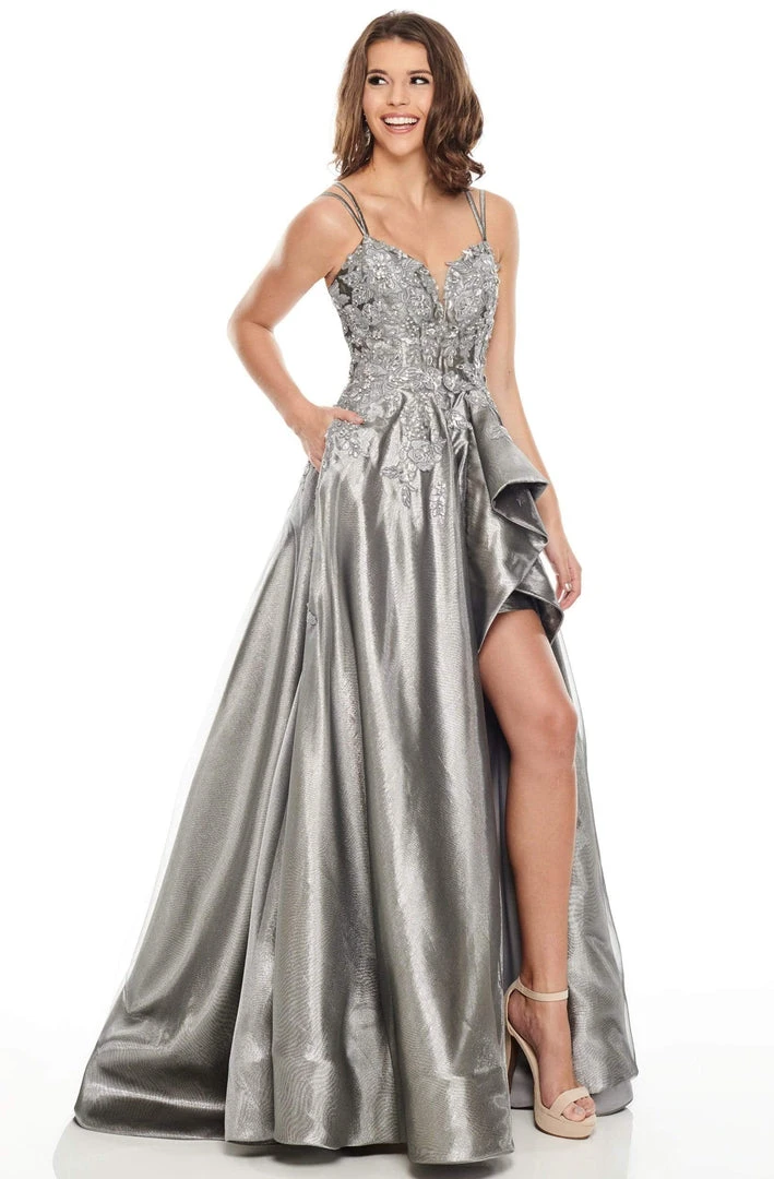 Clothe yourself in creative couture with this stylish Rachel Allan Prom 7051 masterpiece. Styled in shimmer organza, this dress showcases a fitted bodice adorned with beaded appliques for the perfect amount of detail. A plunging V neckline with sheer inset detail at the bust bisects the top as it criss cross the open back. From the side peplum detail reveals a slit to the a-line skirt to perfectly highlight your sexy leg. This dress finishes with a dramatic sweep train. Make a memorable splash at your upscale evening in this lux formal Rachel Allan Prom ensemble.