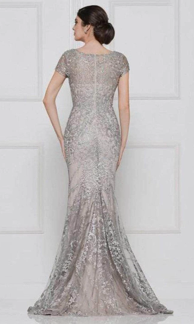 This lace gown charms with a plunging V-neckline and short sleeves. The fitted bodice highlights your curves and from the waist begins a full length trumpet skirt with a sweep train finish. Model is wearing the Slate Blue color.