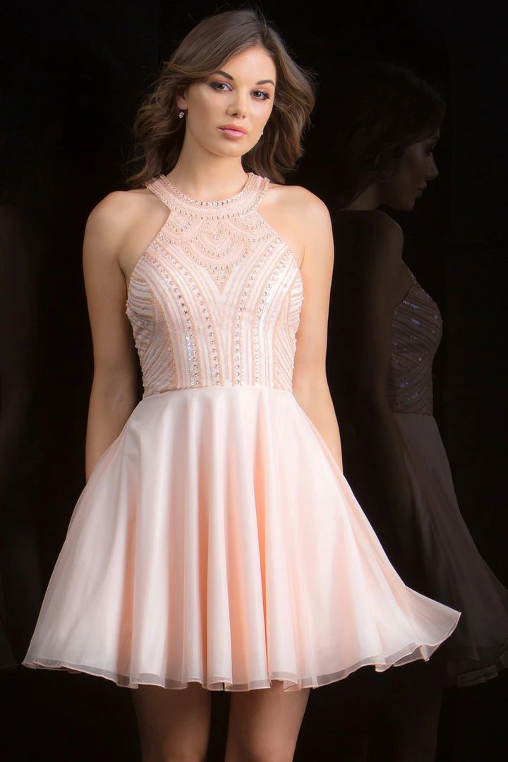 Get glamorous underneath the modern and classic detailing on the A-line silhouette of Scala 48813. Brandishes in a sleeveless, halter neckline with fitted bodice adorned with sparkling beading and sequins. The back has a zipper closure and a chiffon A-line skirt that runs at mid-thigh hem. Go with fun, gorgeous, and youthful dress by Scala.