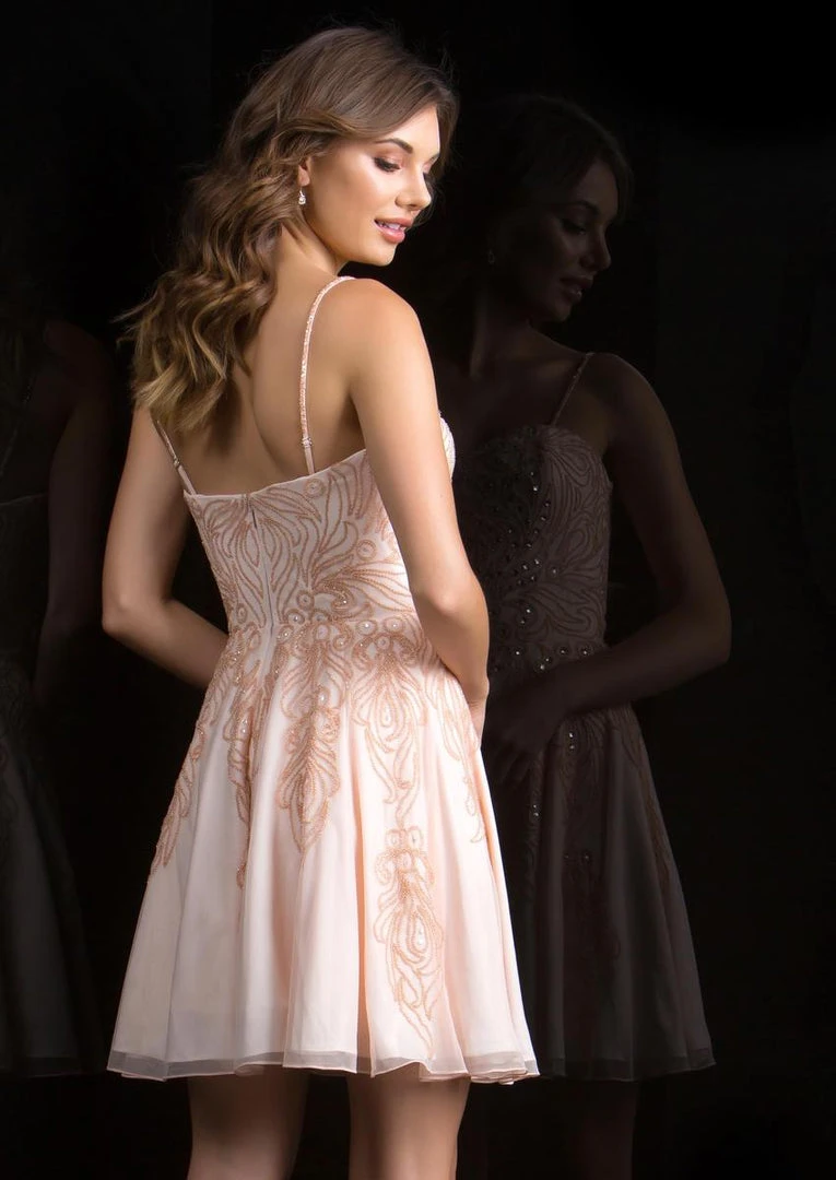 Show off your feminine side with this dazzling cocktail dress by Scala 48834. The fitted bodice is strapless and features a distinct sweetheart neckline. The dress is wrapped in organza fabric and is embellished with beads and shimmering stones. This luxurious homecoming or party ensemble floats and flutters to the mid-thigh hem in darling, frothy layers. Twirl and shine in this captivating creation from Scala.